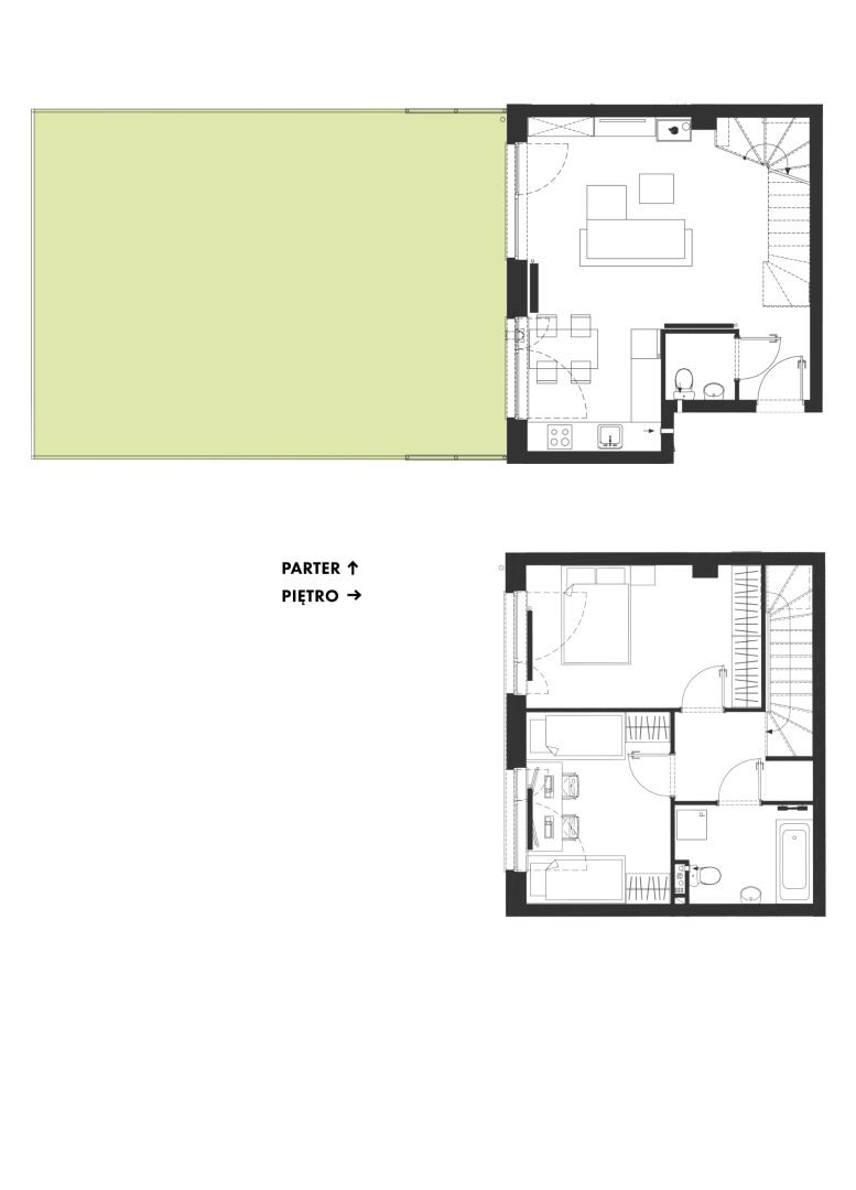 Znajdziemy tu rozwiązania 3 lub 4 pokojowe. W ramach jednego wspólnego wejścia znajdują się cztery mieszkania oraz wspólny kocioł grzewczy dla wszystkich czterech mieszkań. Na parterze każdego z mieszkań znajduje się salon z aneksem kuchennym oraz toaleta. Na piętrze z kolei łazienka oraz dwie lub trzy sypialnie.