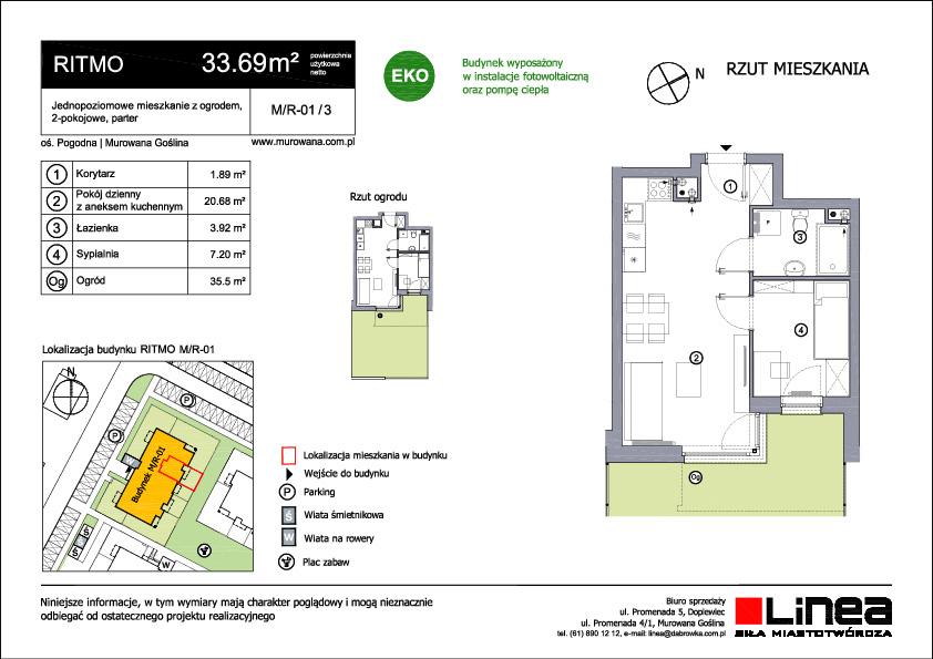 Budynek wielorodzinny o trzech kondygnacjach to nowoczesna i funkcjonalna nieruchomość. Zaprojektowany z myślą o komforcie i zrównoważonym stylu życia, oferuje mieszkania o zróżnicowanej powierzchni, od 25 do 55 metrów kwadratowych, z jednym, dwoma lub trzema pokojami. Mieszkania na parterze wyróżniają się dostępem do urokliwych ogródków, które stanowią doskonałe miejsce do relaksu na świeżym powietrzu, organizacji spotkań towarzyskich czy stworzenia prywatnego ogrodu miejskiego. To unikalna możliwość cieszenia się naturą bez konieczności opuszczania własnego mieszkania. Natomiast mieszkania na wyższych kondygnacjach zostały wyposażone w przestronne balkony, które dodają im uroku i pozwalają mieszkańcom korzystać z widoków na otoczenie. Te przestrzenie zewnętrzne stanowią idealne miejsce do delektowania się poranną kawą czy wieczornym zachodem słońca. Ritmo to wyraz harmonii pomiędzy nowoczesnym designem a praktycznym podejściem do życia codziennego. Dzięki zróżnicowanym powierzchniom mieszkań, spełnia oczekiwania różnych grup mieszkańców, tworząc przy tym przyjazne i wspólne środowisko.