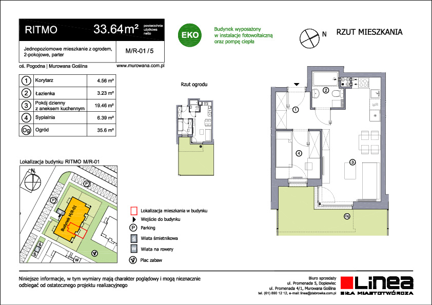 Budynek wielorodzinny o trzech kondygnacjach to nowoczesna i funkcjonalna nieruchomość. Zaprojektowany z myślą o komforcie i zrównoważonym stylu życia, oferuje mieszkania o zróżnicowanej powierzchni, od 25 do 55 metrów kwadratowych, z jednym, dwoma lub trzema pokojami. Mieszkania na parterze wyróżniają się dostępem do urokliwych ogródków, które stanowią doskonałe miejsce do relaksu na świeżym powietrzu, organizacji spotkań towarzyskich czy stworzenia prywatnego ogrodu miejskiego. To unikalna możliwość cieszenia się naturą bez konieczności opuszczania własnego mieszkania. Natomiast mieszkania na wyższych kondygnacjach zostały wyposażone w przestronne balkony, które dodają im uroku i pozwalają mieszkańcom korzystać z widoków na otoczenie. Te przestrzenie zewnętrzne stanowią idealne miejsce do delektowania się poranną kawą czy wieczornym zachodem słońca. Ritmo to wyraz harmonii pomiędzy nowoczesnym designem a praktycznym podejściem do życia codziennego. Dzięki zróżnicowanym powierzchniom mieszkań, spełnia oczekiwania różnych grup mieszkańców, tworząc przy tym przyjazne i wspólne środowisko.