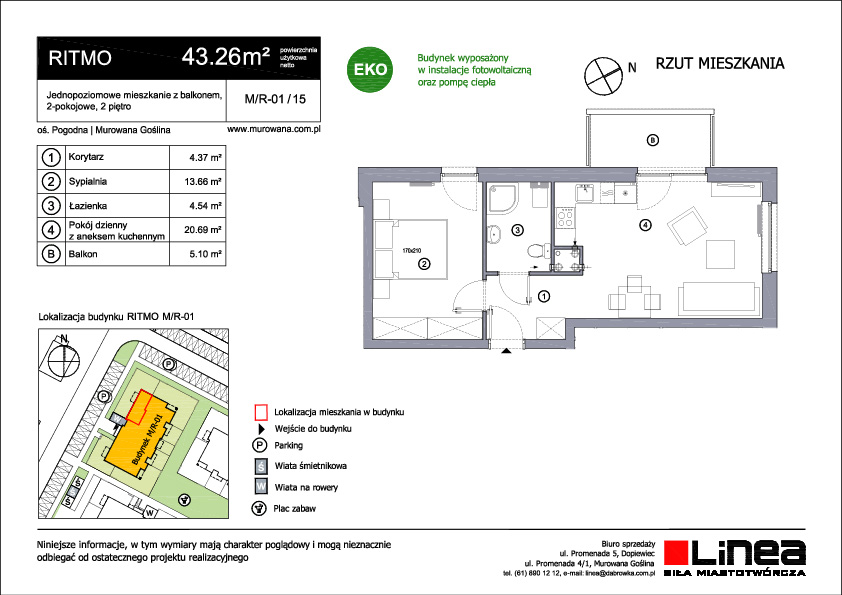 Budynek wielorodzinny o trzech kondygnacjach to nowoczesna i funkcjonalna nieruchomość. Zaprojektowany z myślą o komforcie i zrównoważonym stylu życia, oferuje mieszkania o zróżnicowanej powierzchni, od 25 do 55 metrów kwadratowych, z jednym, dwoma lub trzema pokojami. Mieszkania na parterze wyróżniają się dostępem do urokliwych ogródków, które stanowią doskonałe miejsce do relaksu na świeżym powietrzu, organizacji spotkań towarzyskich czy stworzenia prywatnego ogrodu miejskiego. To unikalna możliwość cieszenia się naturą bez konieczności opuszczania własnego mieszkania. Natomiast mieszkania na wyższych kondygnacjach zostały wyposażone w przestronne balkony, które dodają im uroku i pozwalają mieszkańcom korzystać z widoków na otoczenie. Te przestrzenie zewnętrzne stanowią idealne miejsce do delektowania się poranną kawą czy wieczornym zachodem słońca. Ritmo to wyraz harmonii pomiędzy nowoczesnym designem a praktycznym podejściem do życia codziennego. Dzięki zróżnicowanym powierzchniom mieszkań, spełnia oczekiwania różnych grup mieszkańców, tworząc przy tym przyjazne i wspólne środowisko.