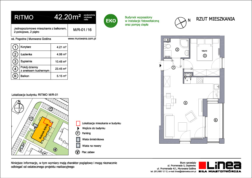 Budynek wielorodzinny o trzech kondygnacjach to nowoczesna i funkcjonalna nieruchomość. Zaprojektowany z myślą o komforcie i zrównoważonym stylu życia, oferuje mieszkania o zróżnicowanej powierzchni, od 25 do 55 metrów kwadratowych, z jednym, dwoma lub trzema pokojami. Mieszkania na parterze wyróżniają się dostępem do urokliwych ogródków, które stanowią doskonałe miejsce do relaksu na świeżym powietrzu, organizacji spotkań towarzyskich czy stworzenia prywatnego ogrodu miejskiego. To unikalna możliwość cieszenia się naturą bez konieczności opuszczania własnego mieszkania. Natomiast mieszkania na wyższych kondygnacjach zostały wyposażone w przestronne balkony, które dodają im uroku i pozwalają mieszkańcom korzystać z widoków na otoczenie. Te przestrzenie zewnętrzne stanowią idealne miejsce do delektowania się poranną kawą czy wieczornym zachodem słońca. Ritmo to wyraz harmonii pomiędzy nowoczesnym designem a praktycznym podejściem do życia codziennego. Dzięki zróżnicowanym powierzchniom mieszkań, spełnia oczekiwania różnych grup mieszkańców, tworząc przy tym przyjazne i wspólne środowisko.