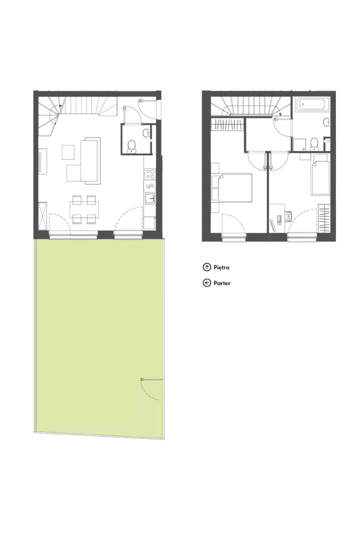 To szeregowiec z dwu-poziomowymi mieszkaniami. Każdy lokal ma tu swój ogród. Znajdziemy tu rozwiązania 3 lub 4 pokojowe. W ramach jednego wspólnego wejścia znajdują się cztery mieszkania o powierzchni 70 lub 83 moraz wspólny kocioł grzewczy dla wszystkich czterech mieszkań. Na parterze każdego z mieszkań znajduje się salon z aneksem kuchennym oraz toaleta. Na piętrze z kolei łazienka oraz dwie lub trzy sypialnie. Mieszkanie posiada możliwość zamontowania kominka i rolet zewnętrznych na parterze.